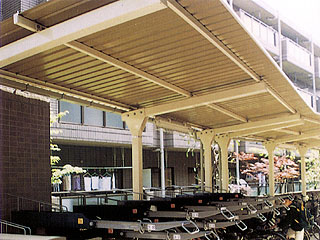 自転車・バイク用上屋「アーチシェルター」は、建物景観に合わせて駐輪場もコーディネート。屋根材にはカラーアルミパネル、小波カラー鉄板、折板、制震鋼板など多種ご用意しております。